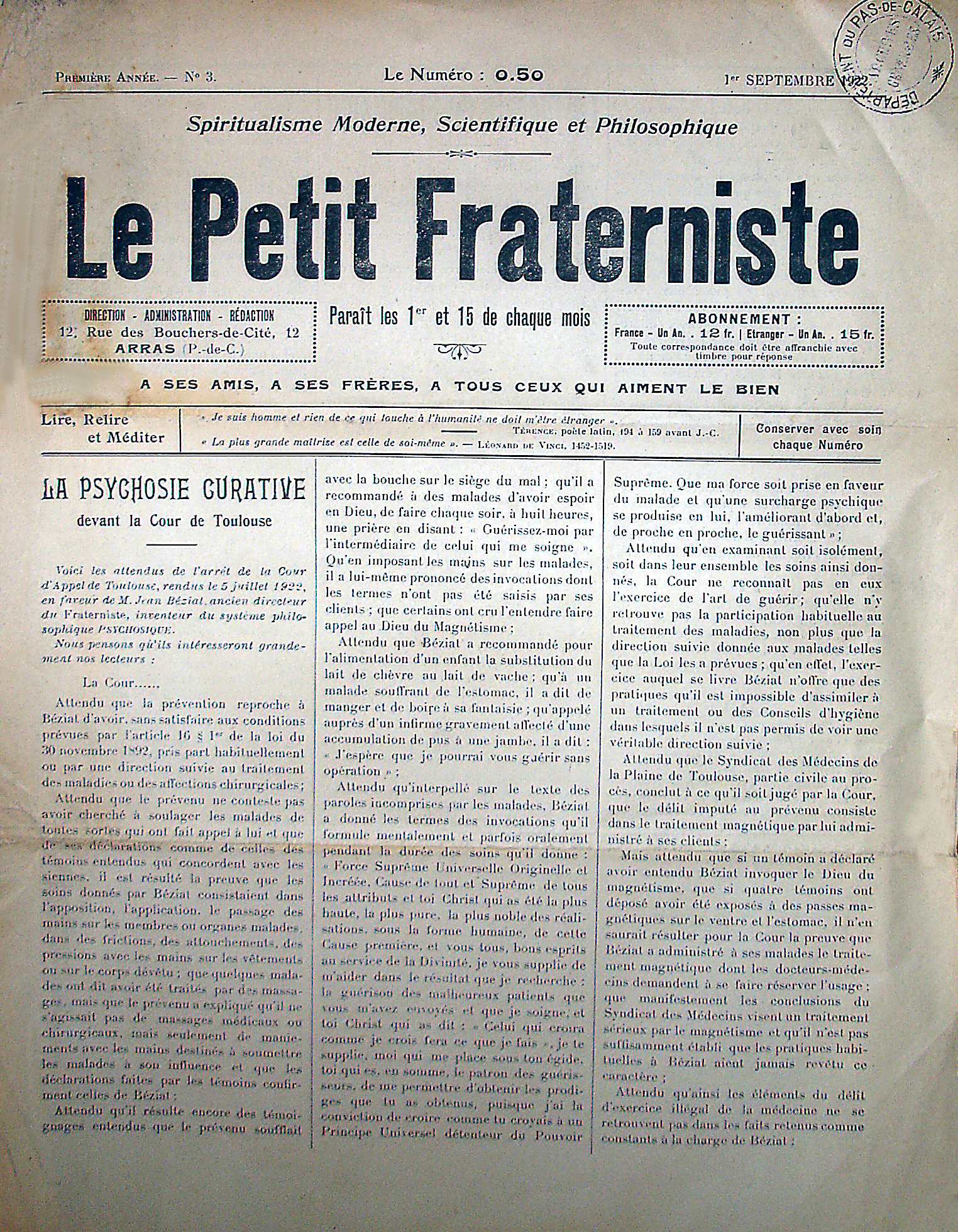 Le second article est beaucoup plus révélateur des intentions de ce périodique. Il s'agit d'une longue lettre de Jean Béziat, guérisseur de son état. Créateur du psychosisme, une doctrine étudiant l'influence du monde de l'occulte sur l'homme, il évoque sa vie, ses « travaux » depuis qu'il a quitté le Nord en 1914. Le numéro 2 du Petit fraterniste, daté du 15 mai 1922, lui permet d'expliquer le psychotisme. Cet exposé doctrinal est complété par une liste de périodiques recommandés aux lecteurs : essentiellement des publications de Kardec, fondateur de la Revue spirite, de Léon Denis, président d'honneur de l'Union spirite française, Gabriel Delanne. Dans les numéros suivants, le journal révèle aussi que les activités de Béziat ne font pas l'unanimité. L'homme est en effet poursuivi pour la troisième fois pour ses activités de guérisseur.